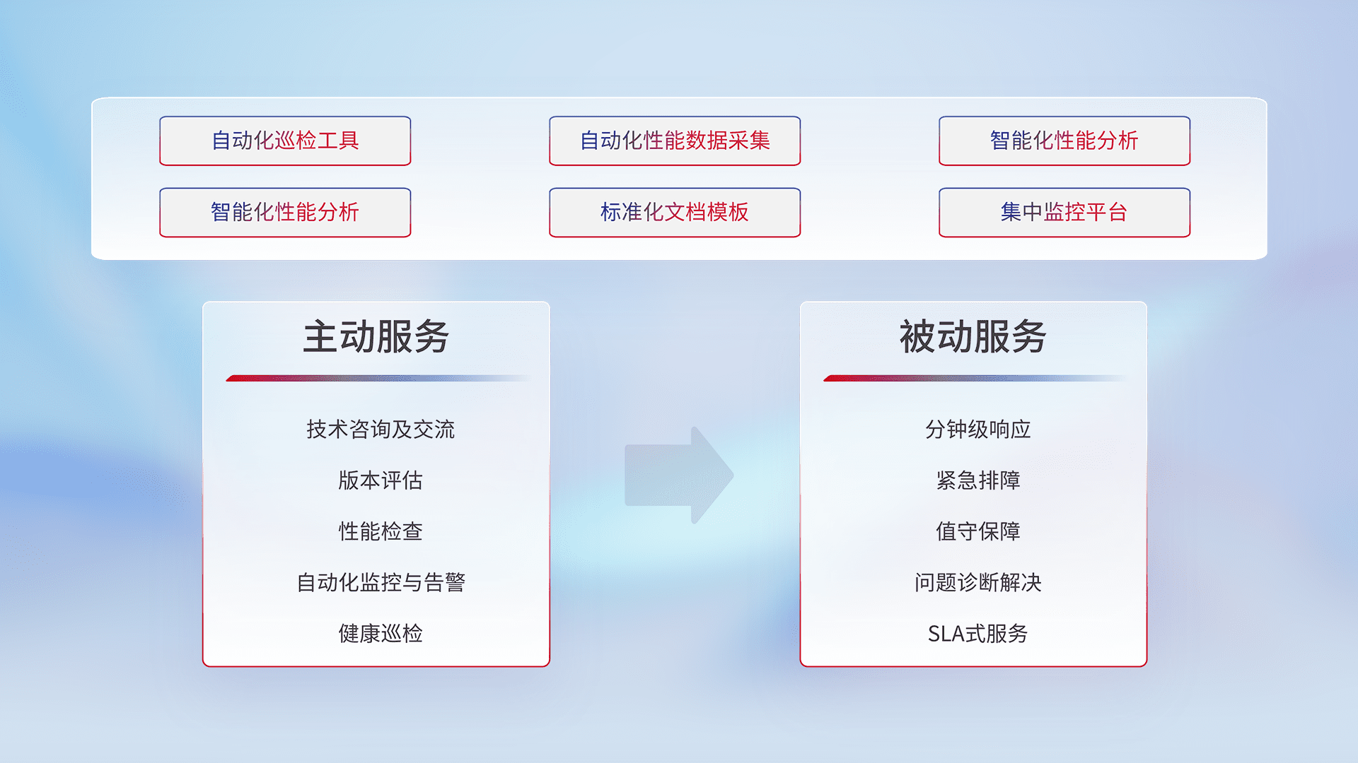 智能化工具和标准化文档,,,,保障服务质量,,,,提供主动服务(包含技术咨询、、、、版本评估、、、、性能检查、、、、自动化监控与告警、、、健康巡检)和被动服务包含(分钟级响应、、、紧急排障、、、值守保障、、问题诊断解决、、SLA服务)。。。。